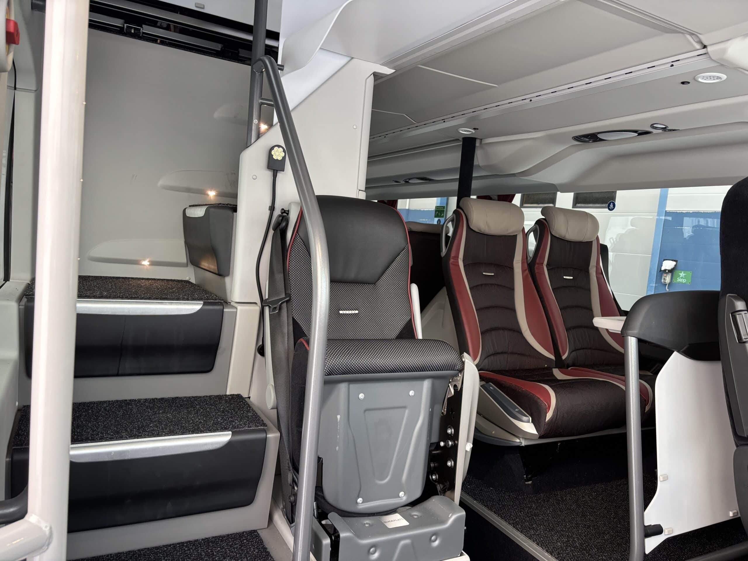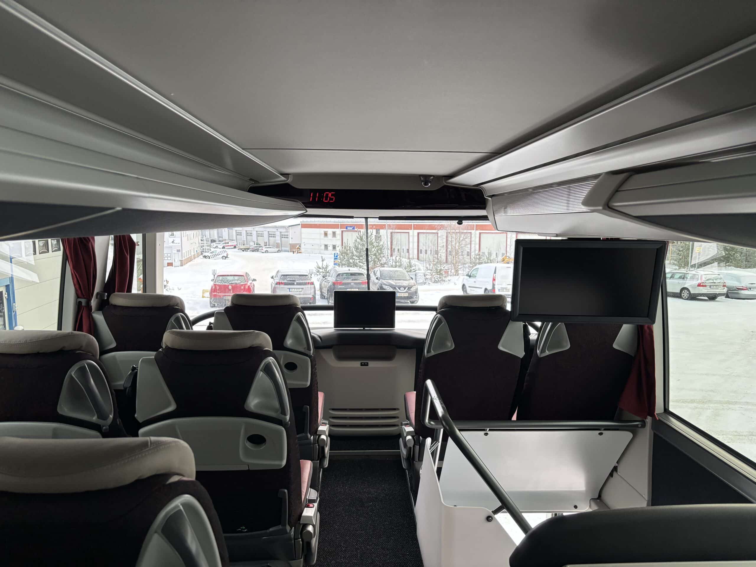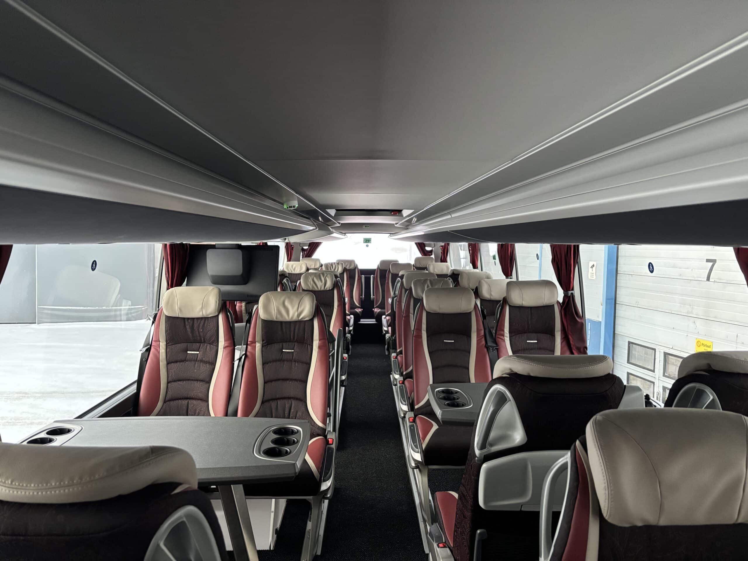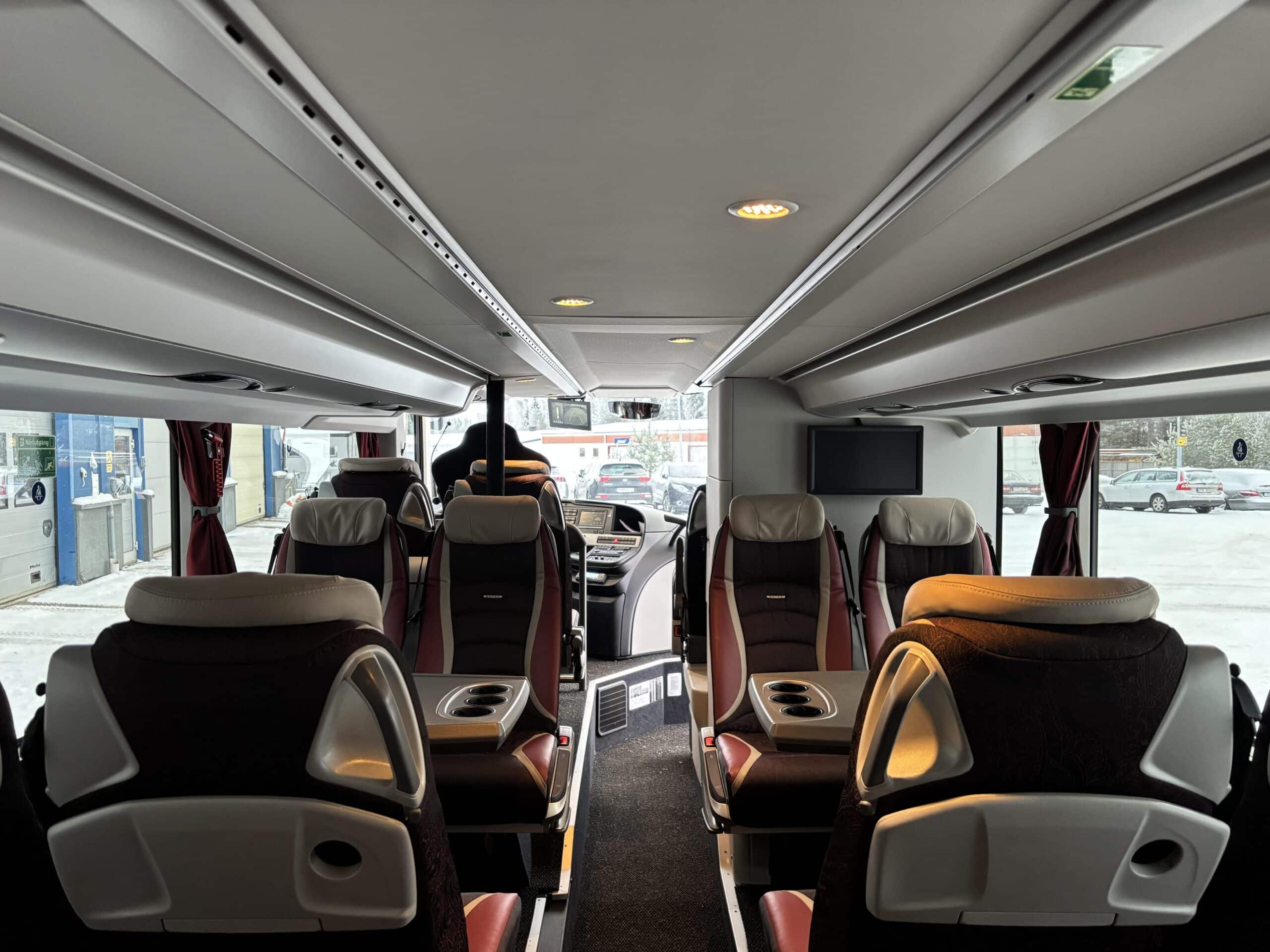 Aircondition, alcolås, säkerhetsbälten, guideplats med mikrofon, minikök med kaffekokare, microvågsugn & kyl, 220-voltsuttag, toalett, skärm/DVD, wifi – trådlöst internet samt anslutning dator till monitor för att visa exempelvis powerpointpresentationer, teckentolk mm. Bussen har flera konferensdelar med sammanlagt 24 platser