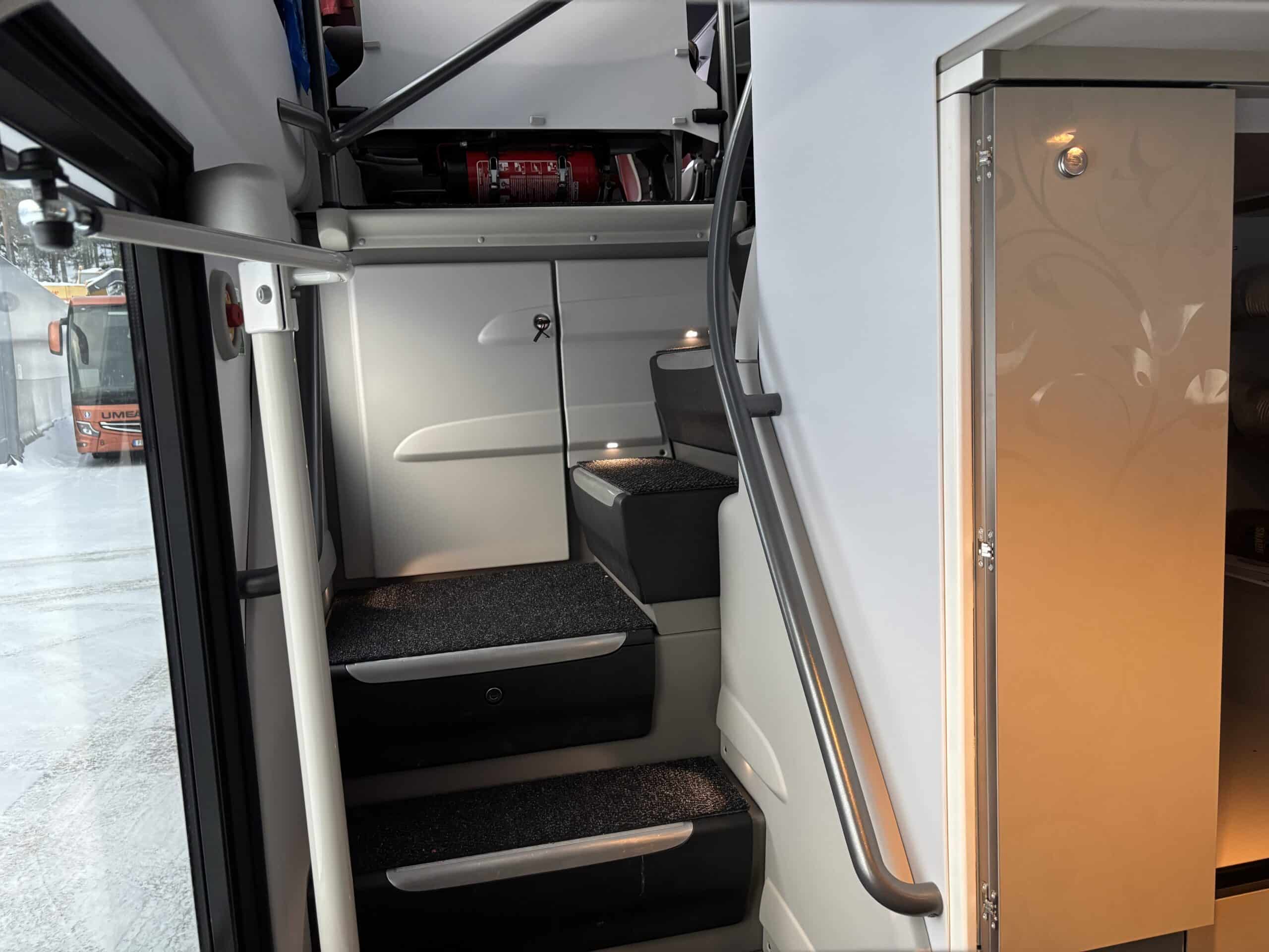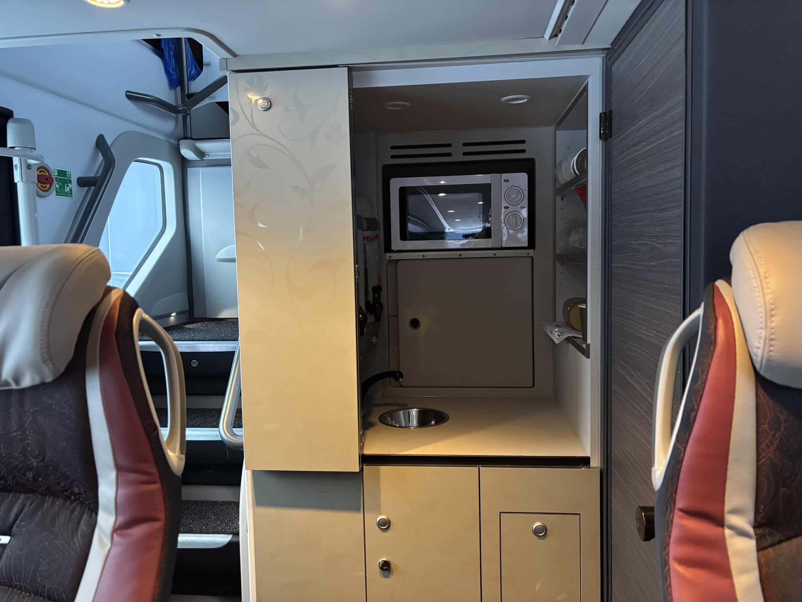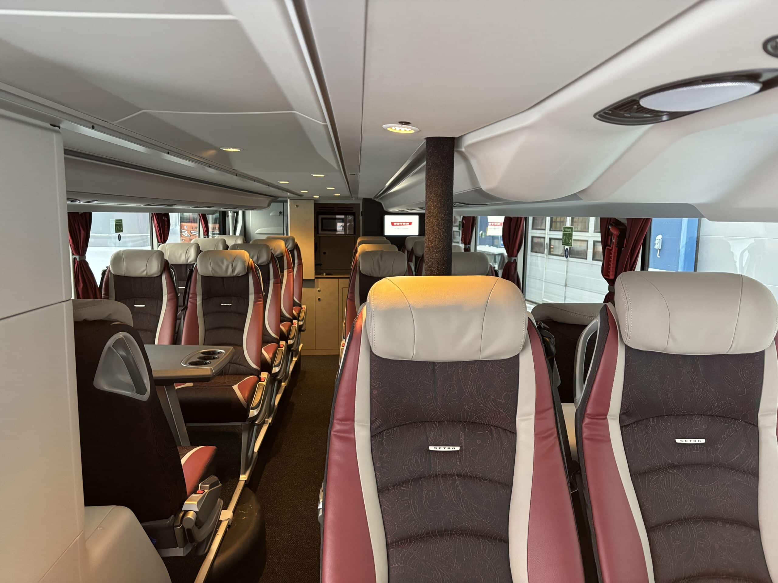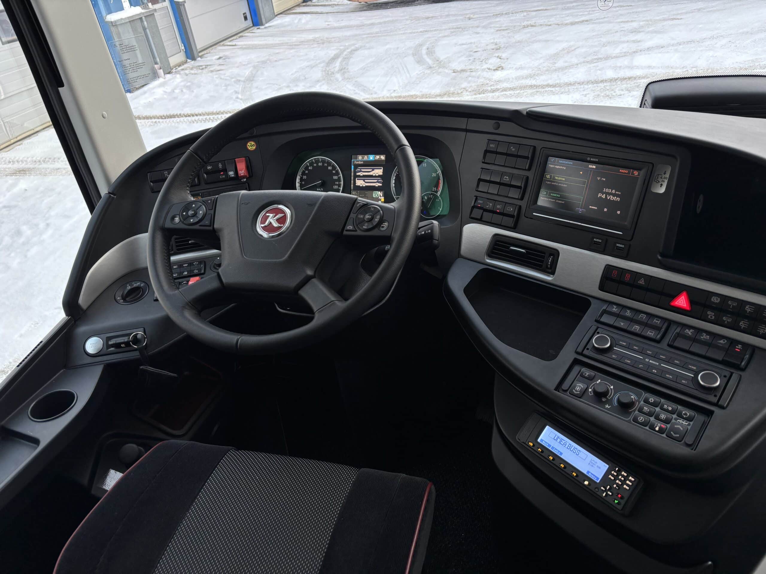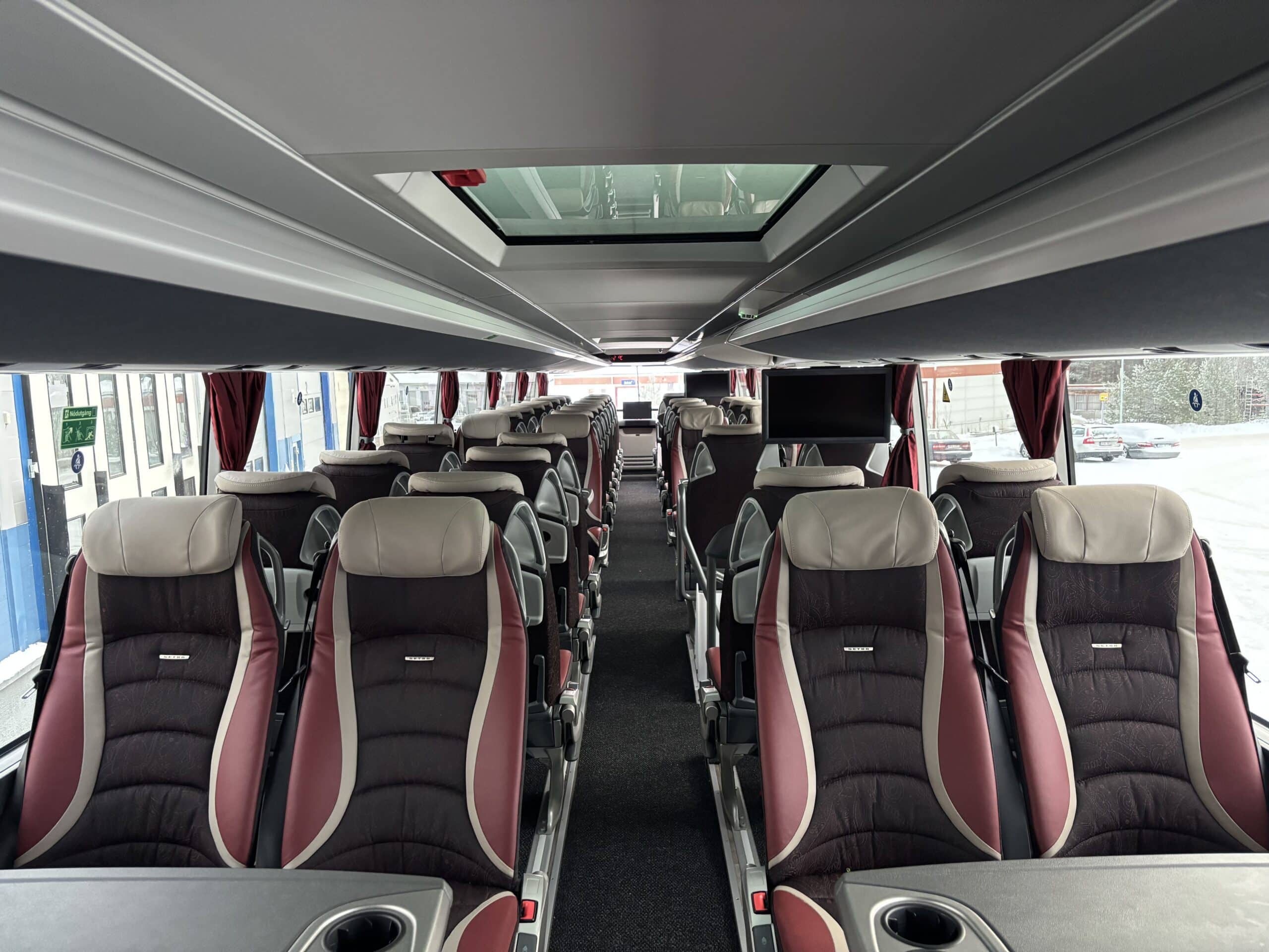Aircondition, alcolås, säkerhetsbälten, guideplats med mikrofon, minikök med kaffekokare, microvågsugn & kyl, 220-voltsuttag, toalett, skärm/DVD, wifi – trådlöst internet samt anslutning dator till monitor för att visa exempelvis powerpointpresentationer, teckentolk mm. Bussen har flera konferensdelar med sammanlagt 24 platser